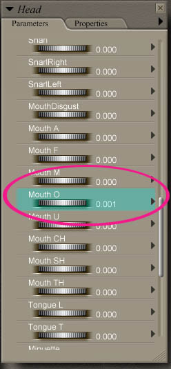 * Still on frame 5, find "Mouth O" in the parameter dials. Set a keyframe for this setting by changing its value to .001 . We will need this keyframe as a placeholder for frames 6 and 7.